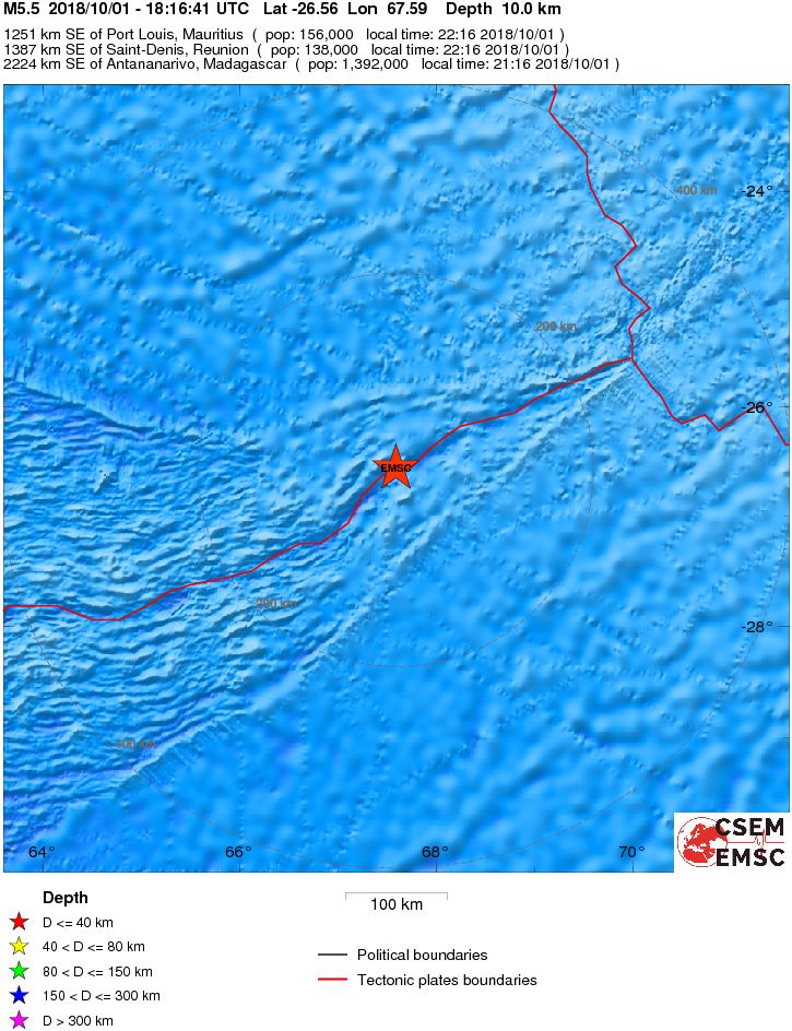 La ora 6h02min UTC s-a produs un cutremur cu magnitudinea de 5,1 grade la adancimea de 10 km in zona de tripla jonctiune de pe Dorsala Indiana.
