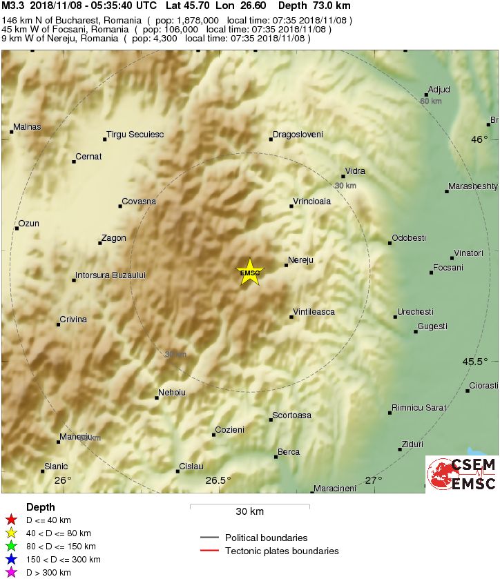 Primul seism a avut loc la ora locala 5h47min49sec (3h47min49sec UTC). Potrivit datelor publicate de Institutul National de Cercetare-Dezvoltare pentru Fizica-Pamantului, epicentrul cutremurului a fost localizat in Muntii Vrancei, zona NEREJU, judetul Vrancea (45,73 grade latitudine Nordica, 26,63 grade longitudine Estica). Cutremurul s-a produs la adancimea de 73,7 km si a avut magnitudinea de 3,7 grade pe scara Richter. Intensitatea maxima a fost de II-III grade pe scara Mercalli.