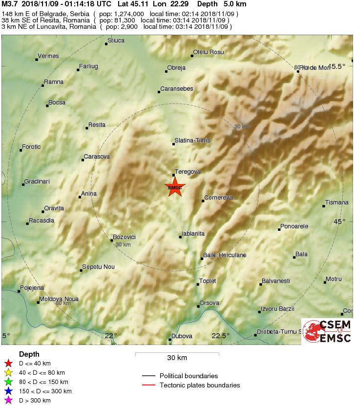 Cutremurul a avut loc la ora locala 3h14min18sec (1h14min18sec UTC). Potrivit datelor publicate de Institutul National de Cercetare-Dezvoltare pentru Fizica Pamantului, epicentrul miscarii seismice a fost localizat in partea nordica a Culoarului Cernei, la Sud de localitatea TEREGOVA, judetul Caras-Severin (45,11 grade latitudine Nordica, 22,29 grade longitudine Estica).