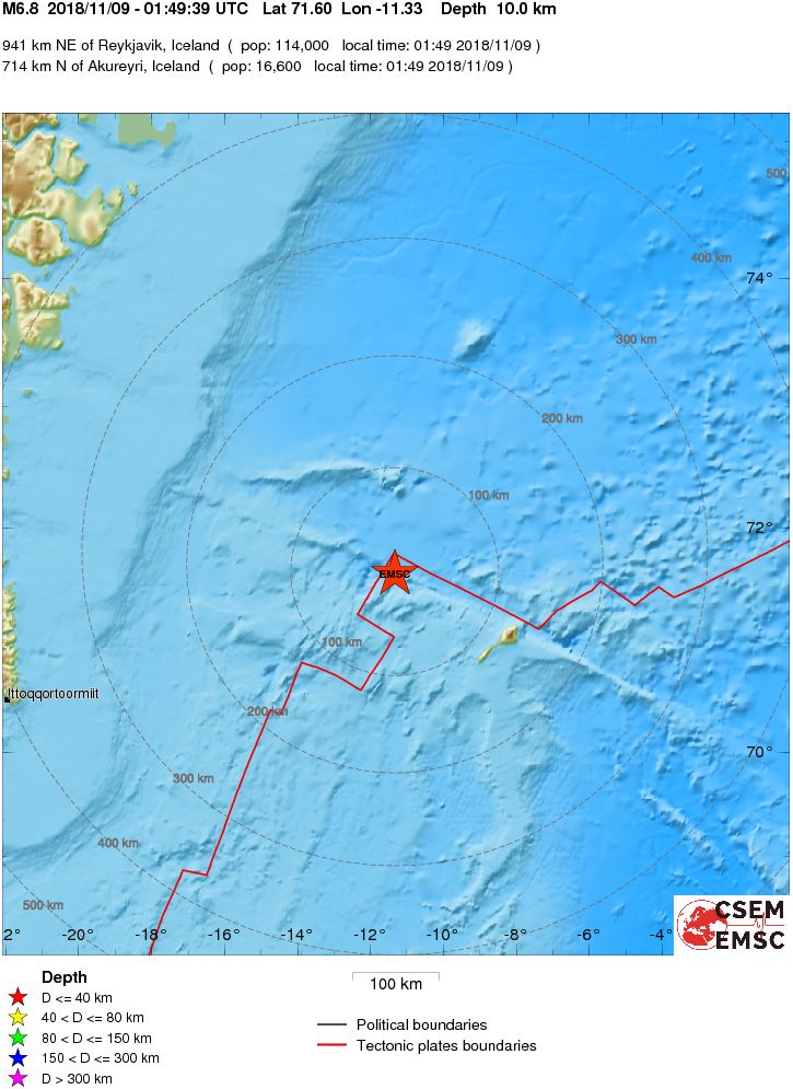 Seismul a avut loc la ora 1h49min UTC (ora locala 1h49min). Potrivit datelor publicate de Centrul Seismologic Euro-Mediteranean, epicentrul cutremurului a fost localizat in Oceanul Arctic, in zona Insulei Jan Mayen, la cca. 941 km Nord-Est de Reykjavík, Islanda. Cutremurul s-a produs la adancimea de 10 km si a avut magnitudinea de 6,8 grade pe scara bazata pe moment seismic. Nu a existat risc de tsunami.
