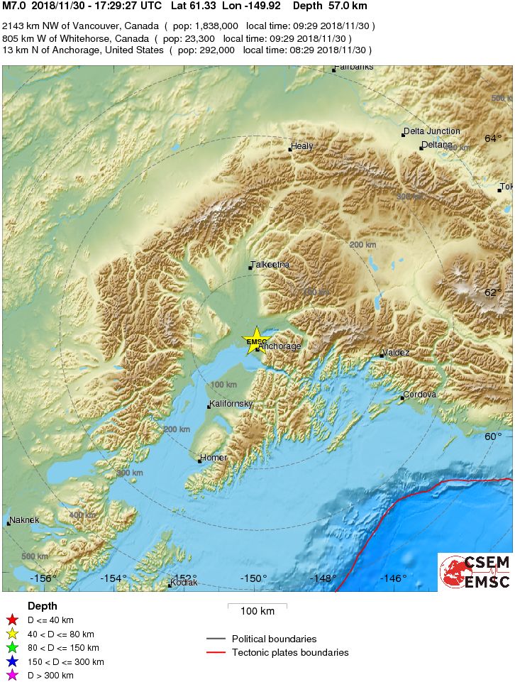 Seismul s-a produs la ora 17h29min UTC (ora locala 8h29min). Potrivit datelor publicate de Centrul Seismologic Euro-Mediteranean, epicentrul seismului a fost localizat la Nord de localitatea Anchorage. Cutremurul s-a produs la adancimea de 57 km si a avut magnitudinea de 7,0 grade pe scara bazata pe moment seismic.