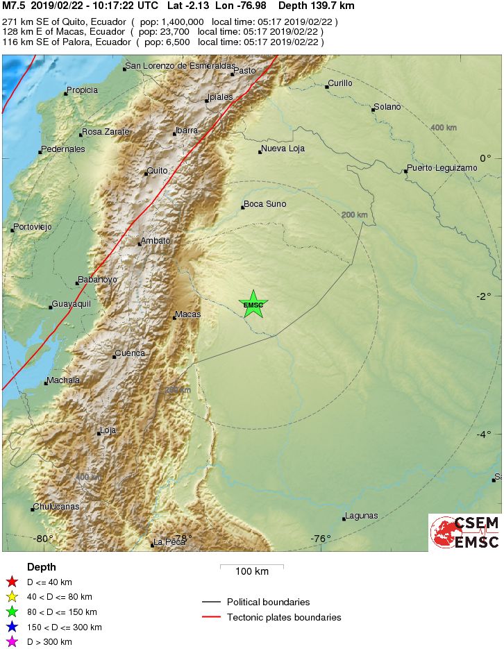 Un cutremur major, cu magnitudinea moment de 7,5 grade, s-a produs in ziua de vineri, 22 februarie, in zona de granita dintre Peru si Ecuador.