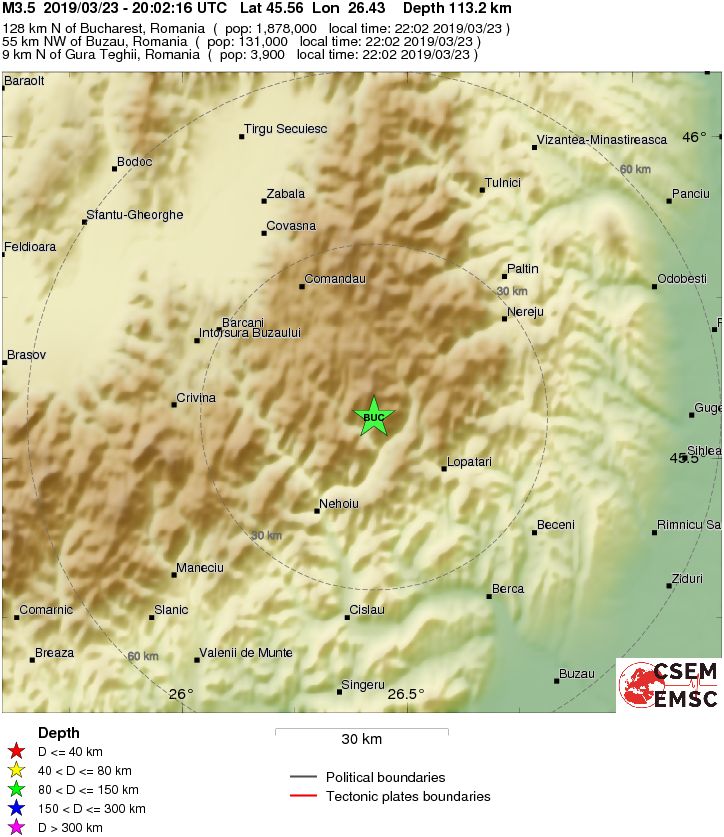 Cutremurul a avut loc la ora locala 22h02min16sec (20h02min16sec UTC). Potrivit datelor publicate de Institutul National de Cercetare-Dezvoltare pentru Fizica Pamantului, epicentrul seismului a fost localizat in Muntii Buzaului, zona GURA TEGHII, judetul Buzau (45,56 grade latitudine Nordica, 26,43 grade latitudine Nordica).