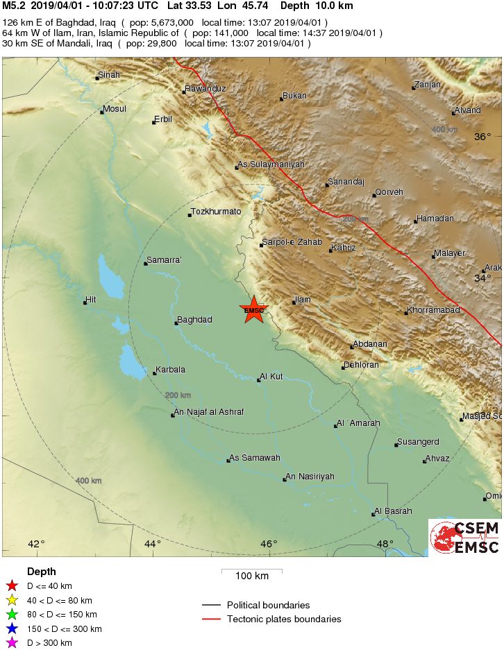 Cutremurul s-a produs la ora 10h07min UTC (ora locala 13h07min in Iraq). Potrivit datelor publicate de Centrul Seismologic Euro-Mediteranean, epicentrul seismului a fost localizat in zona de granita dintre Iran si Iraq, la 126 km Est de Baghdad. Seismul s-a produs la adancimea de 10 km si a avut magnitudinea de 5,2 grade pe scara bazata pe moment seismic. Un alt cutremur, cu magnitudinea de 4,9 grade, s-a produs in aceeasi zona la ora 10h16min UTC (ora locala 13h16min). De asemenea, s-au inregistrat si mai multe replici slabe.