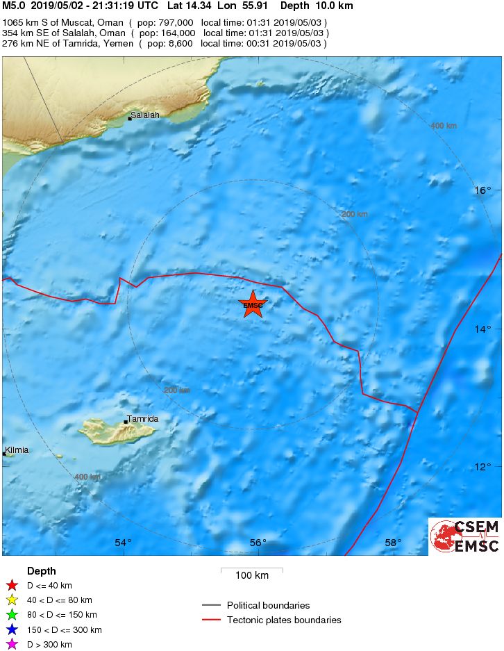 Seismul a avut loc la ora 21h31min UTC (ora locala 0h31min a zilei de 3 mai in Yemen). Potrivit datelor publicate de Centrul Seismologic Euro-Mediteranean, epicentrul seismului a fost localizat in apropierea fracturii Owen. Cutremurul s-a produs la adancimea de 10 km si a avut magnitudinea mb 5,0.