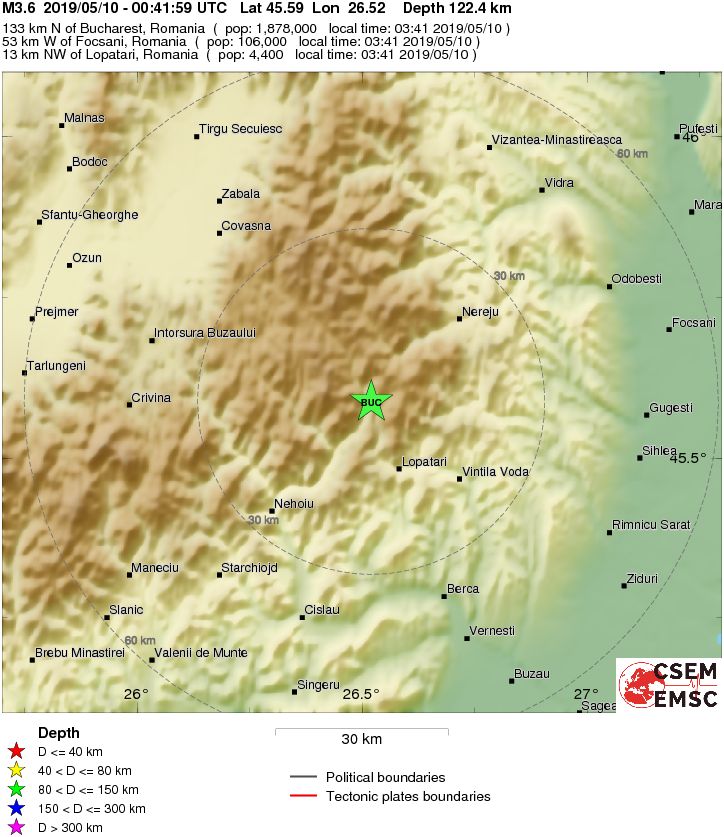 Seismul a avut loc la ora locala 3h41min59sec (0h41min59sec UTC). Potrivit datelor publicate de Institutul National de Cercetare-Dezvoltare pentru Fizica Pamantului, epicentrul cutremurului a fost localizat in Muntii Buzaului, zona LOPATARI, judetul Buzau (45,59 grade latitudine Nordica, 26,52 grade longitudine Estica).