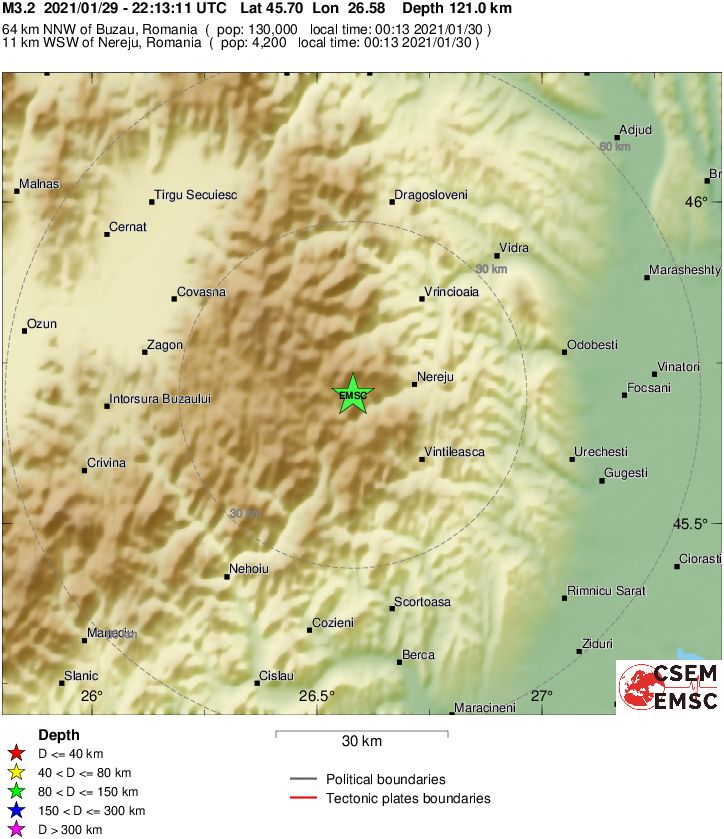Un cutremur subcrustal, cu magnitudinea ML de 3,7 grade, s-a produs in noaptea de vineri 29 ianuarie spre sambata 30 ianuarie.