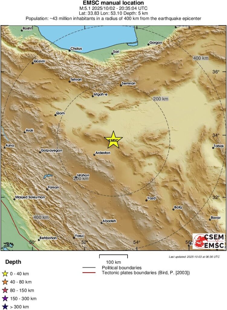 Un cutremur moderat, cu magnitudinea mb de 5,1 grade (magnitudinea locala 5,1), s-a produs in ziua de joi, 2 octombrie, in centrul Iranului, provincia Isfahan.