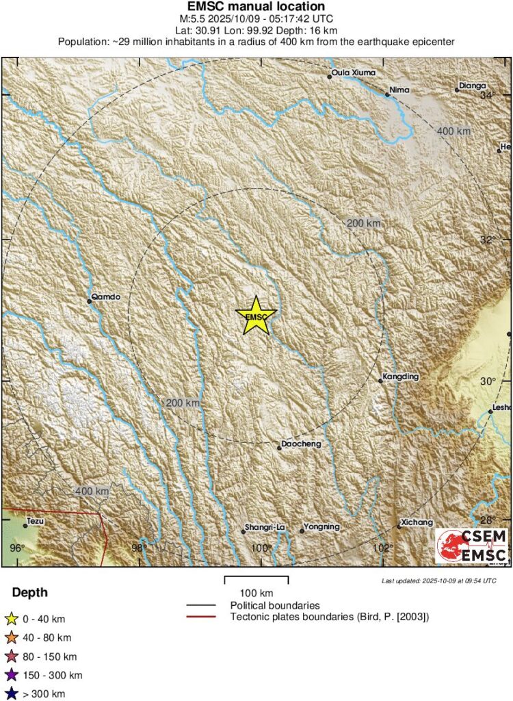 Un cutremur moderat, cu magnitudinea moment de 5,5 grade, s-a produs in ziua de joi, 9 octombrie, in China (Vestul provinciei Sichuan).