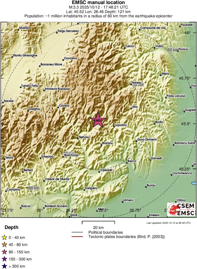 Un cutremur subcrustal minor, cu magnitudinea locala de 3,7 grade, s-a produs in ziua de duminica, 12 octombrie, in regiunea Vrancea.