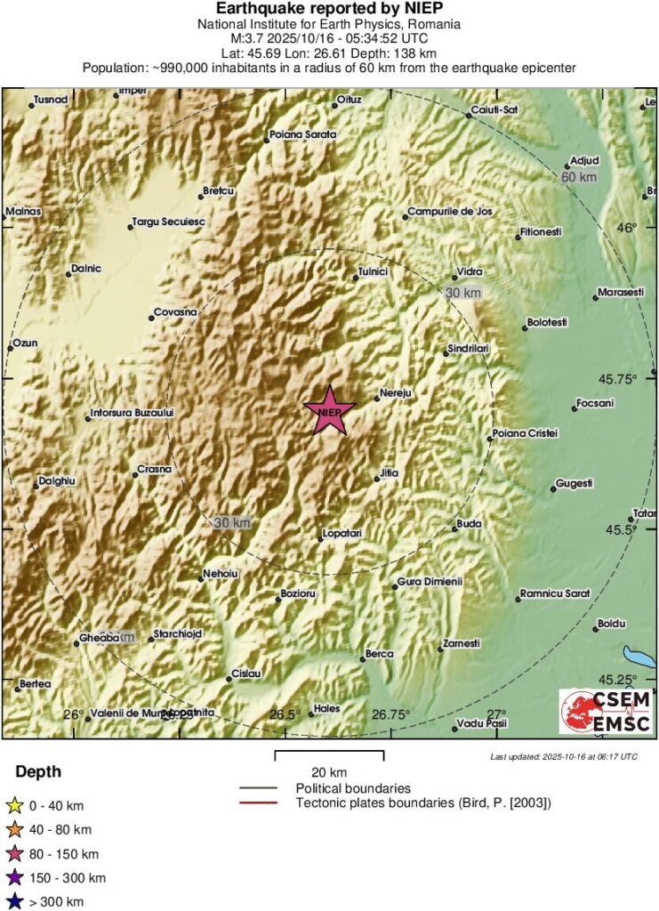 Un cutremur subcrustal minor, cu magnitudinea locala de 3,7 grade, s-a produs in ziua de joi, 16 octombrie, in regiunea Vrancea.