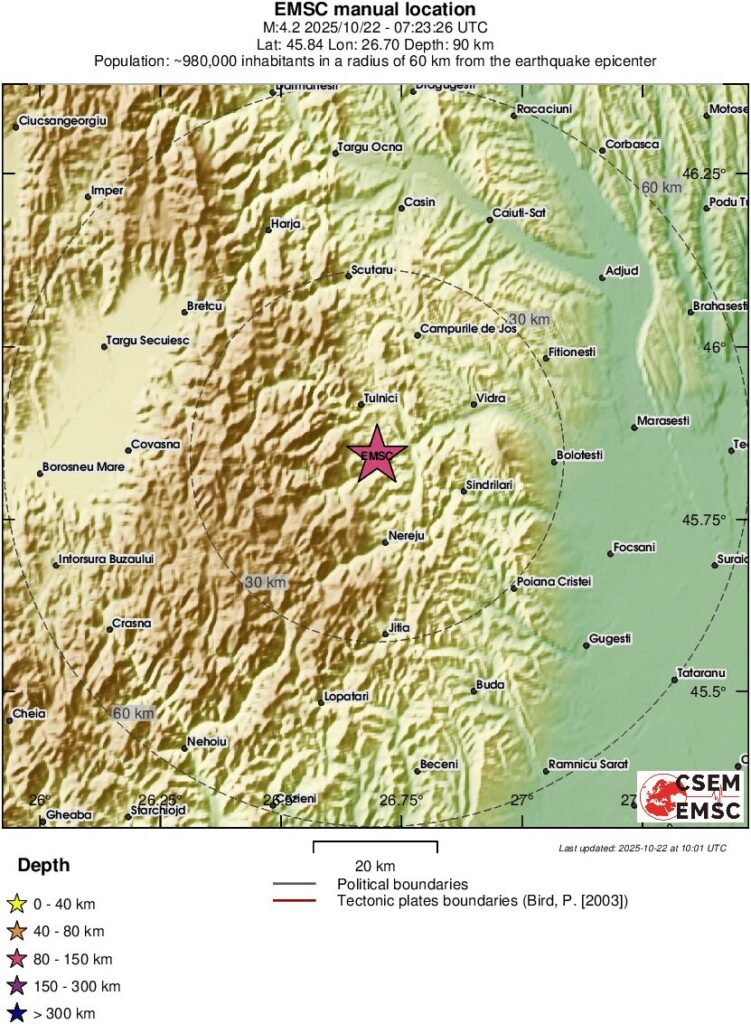 Un cutremur subcrustal minor, cu magnitudinea locala de 4,2 grade, s-a produs in ziua de miercuri, 22 octombrie, in regiunea Vrancea.