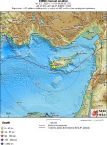 Seismul a avut loc la ora 14h23min UTC (ora locala 16h23min). Potrivit datelor publicate de Centrul Seismologic Euro-Mediteranean, epicentrul seismului a fost localizat in Sud-Vestul Ciprului, la 56 km Vest-Nord-Vest de orasul Limassol.