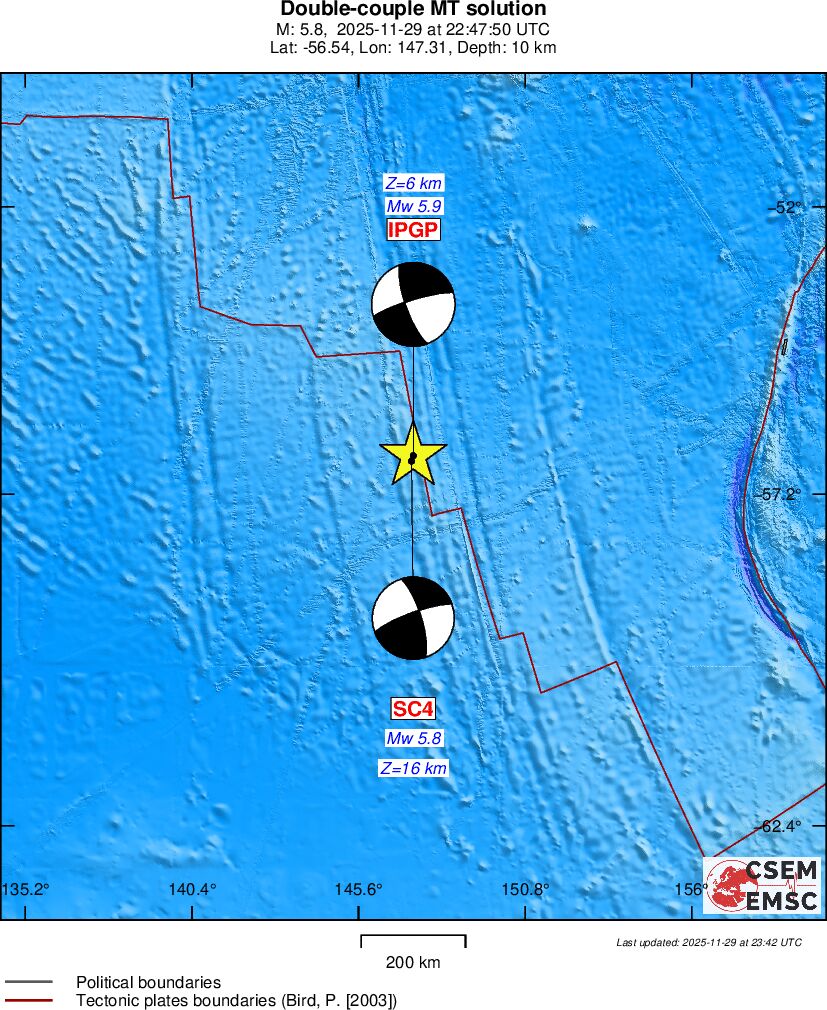 Un alt cutremur moderat, cu magnitudinea moment de 5,9 grade, a avut loc tot in ziua de sambata, 29 noiembrie, tot la Vest de Insula Macquarie, dar cu epicentrul localizat putin mai la Nord-Est fata de epicentrul celui de-al doilea cutremur.