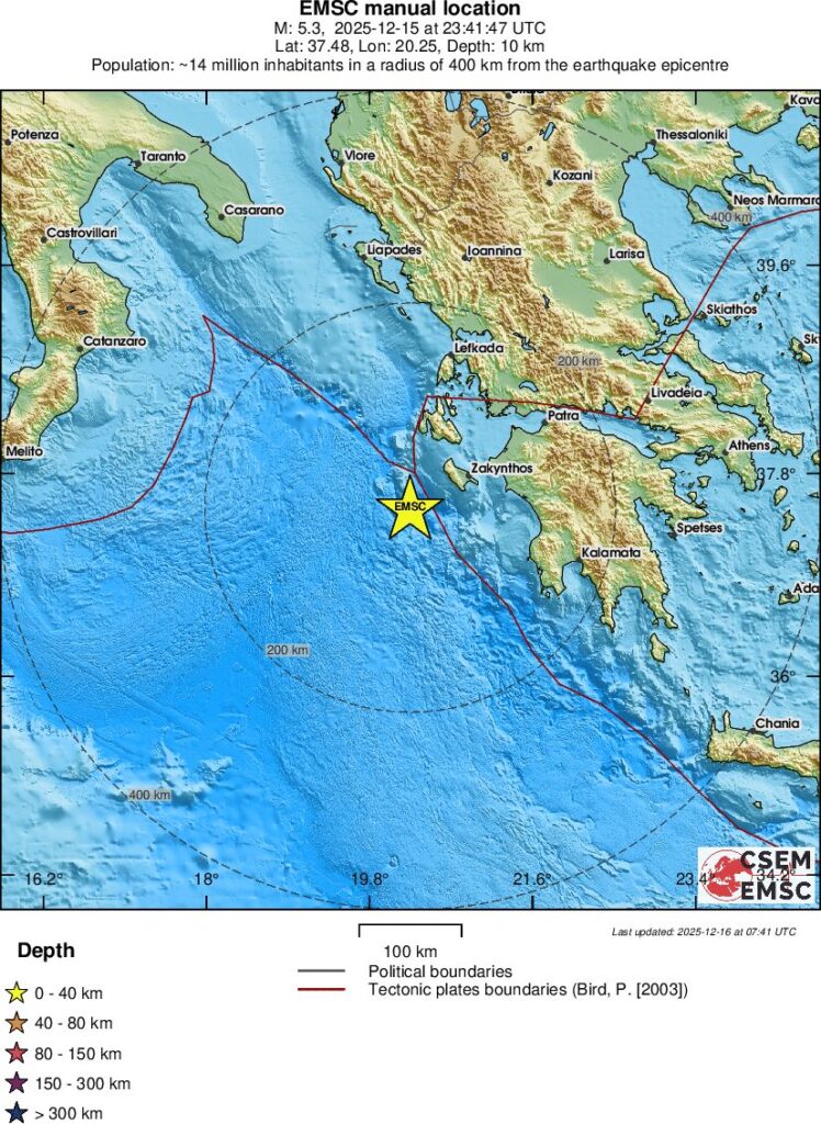 Un cutremur moderat, cu magnitudinea moment de 5,3 grade (magnitudinea locala 5,2), s-a produs in ziua de luni, 15 decembrie, in Marea Ionica.