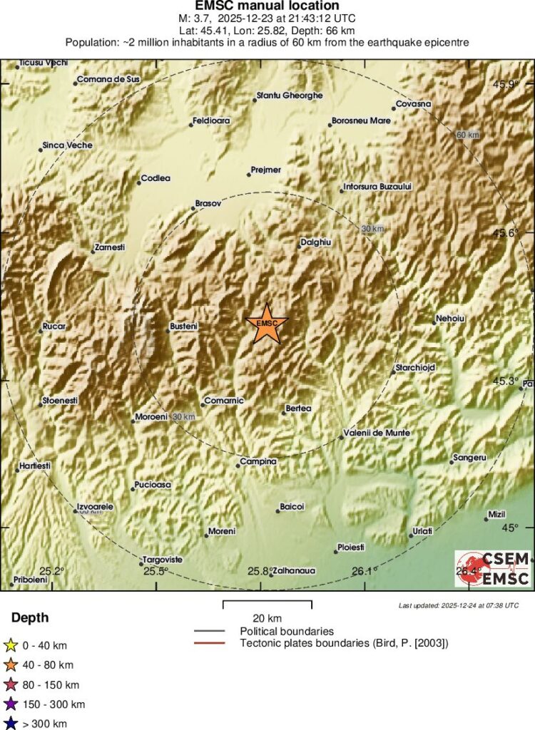 Un cutremur subcrustal minor, cu magnitudinea locala de 3,7 grade, s-a produs in noaptea de marti, 23 decembrie, spre miercuri, 24 decembrie, in Nordul Munteniei-Valea Teleajenului (judetul Prahova).
