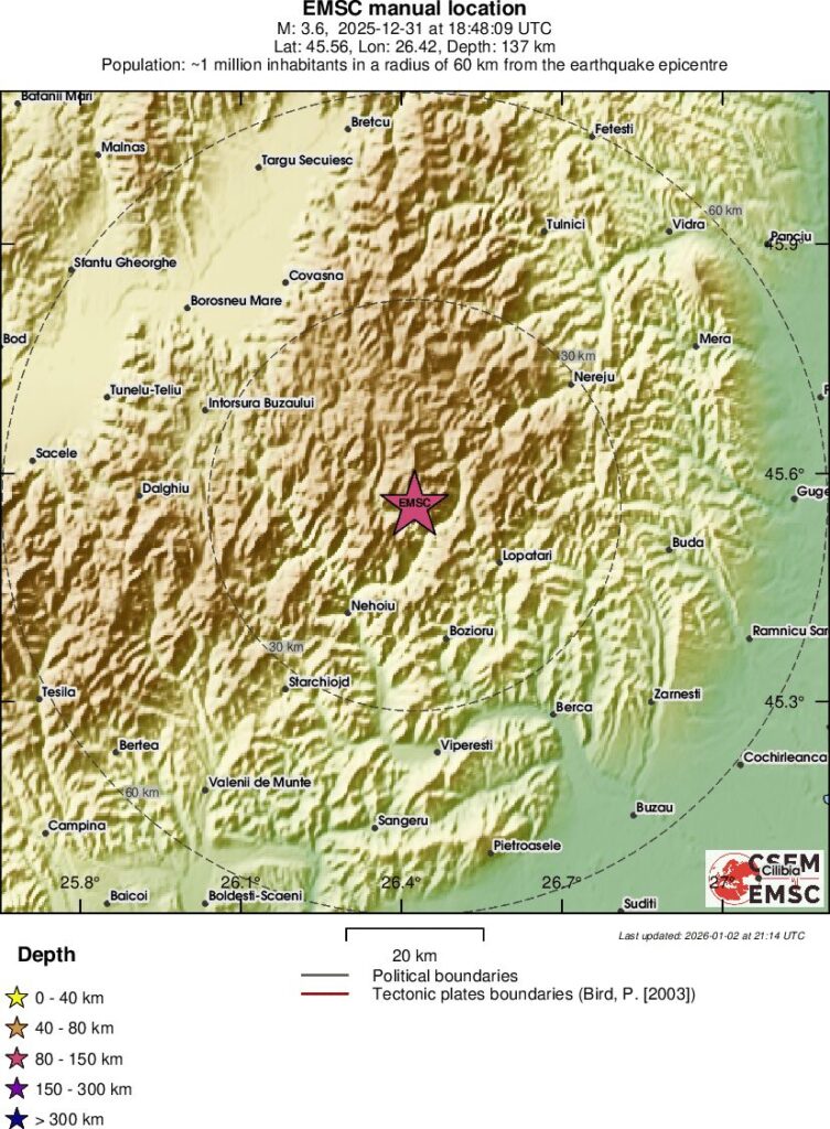 Un cutremur subcrustal minor, cu magnitudinea locala de 3,7 grade, s-a produs in ziua de miercuri, 31 decembrie, in regiunea Vrancea.