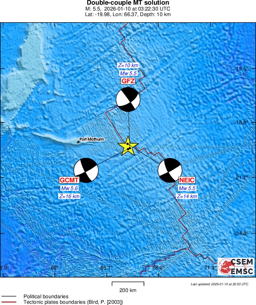 EMSC: Mecanism de focar cutremur Regiunea Mauritius-Reunion 10 ianuarie