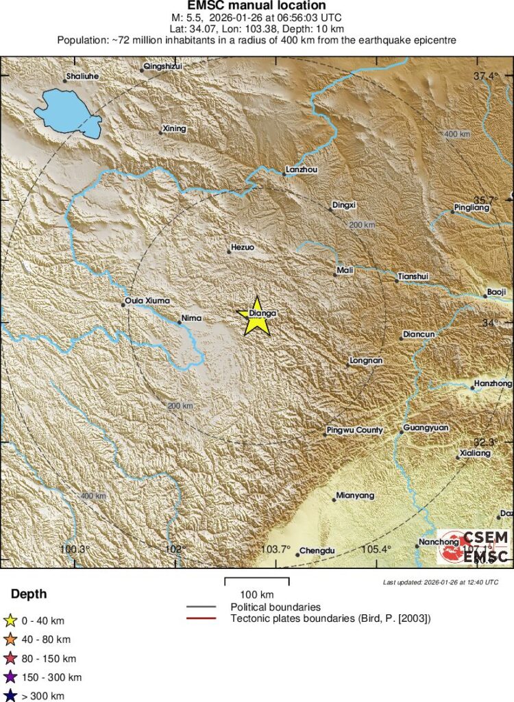 Un cutremur moderat, cu magnitudinea mb de 5,5 grade (magnitudinea moment 5,5), s-a produs in ziua de luni, 26 ianuarie, in Nord-Vestul Chinei (provincia Gansu).