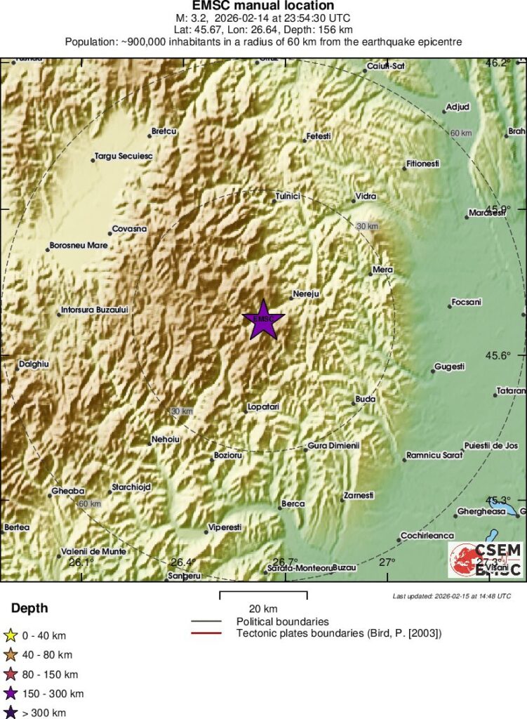 Seismul a avut loc la ora locala 1h54min30sec (ora 23h54min30sec UTC in ziua de 14 februarie). Potrivit datelor publicate de Institutul National de Cercetare-Dezvoltare pentru Fizica Pamantului, epicentrul seismului a fost localizat in Muntii Vrancei, la Sud-Vest de NEREJU, judetul Vrancea (45,67 grade latitudine Nordica, 26,64 grade longitudine Estica).