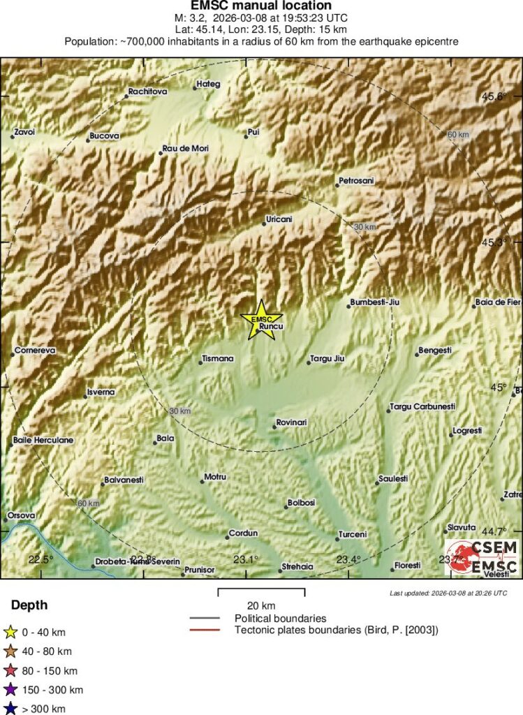Un cutremur crustal minor, cu magnitudinea locala ML de 3,3 grade, s-a produs in ziua de duminica, 8 martie, in Oltenia (judetul Gorj).