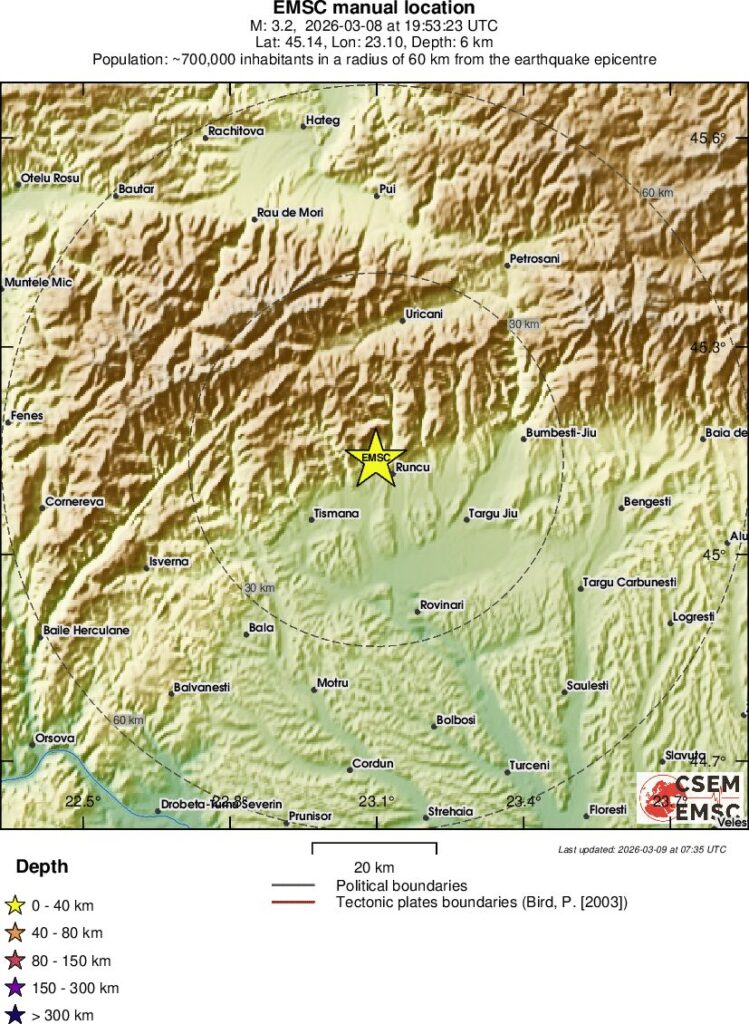 Un cutremur crustal minor, cu magnitudinea locala ML de 3,3 grade, s-a produs in ziua de duminica, 8 martie, in Oltenia (judetul Gorj).